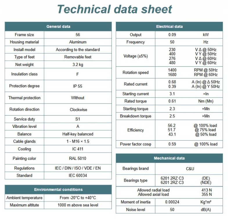 Silnik elektryczny 0,09kW 1400 obr/min. 56 B3 jest także wyposażony w ochronę termiczną, która chroni go przed przeciążeniem i przegrzaniem, co wpływa na jeszcze większą trwałość urządzenia.