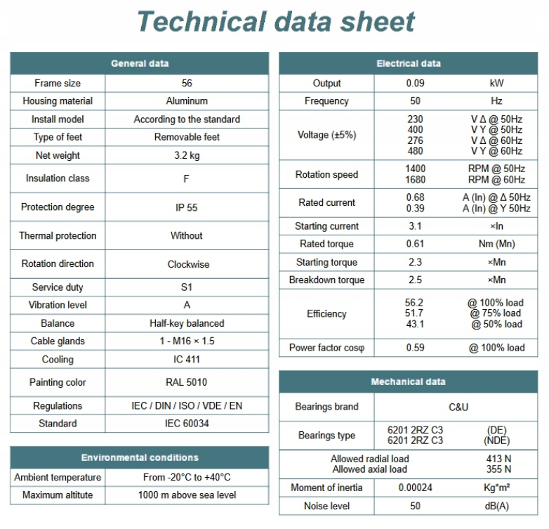 Silnik elektryczny 0,09kW 1400 obr/min. 56 B3 jest także wyposażony w ochronę termiczną, która chroni go przed przeciążeniem i przegrzaniem, co wpływa na jeszcze większą trwałość urządzenia.