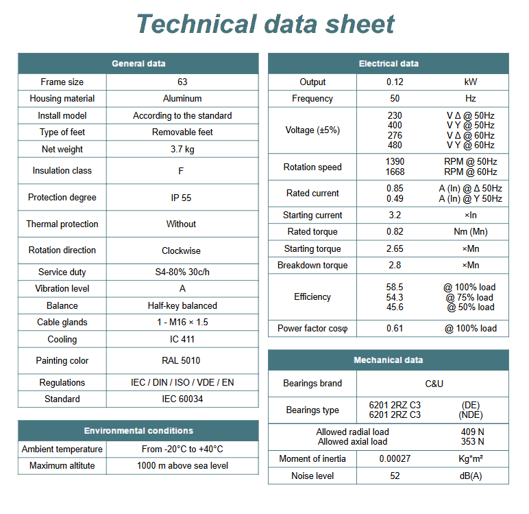 Silnik ten posiada moc 0,12kW, co pozwala na płynną pracę przy niskim zużyciu energii elektrycznej. Jednak pomimo swojej niewielkiej mocy, jest w stanie wytworzyć 1400 obrotów na minutę, co czyni go wydajnym w swojej klasie.