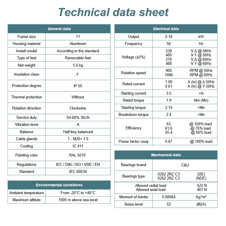 Silnik ten został wyposażony w 900 obrotów na minutę, co gwarantuje płynną pracę bez jakichkolwiek zakłóceń. Jego konstrukcja typu 71 B5 pozwala na łatwe i wygodne montażu na różnego rodzaju powierzchniach, dzięki czemu sprawdzi się w różnego rodzaju zastosowaniach.
