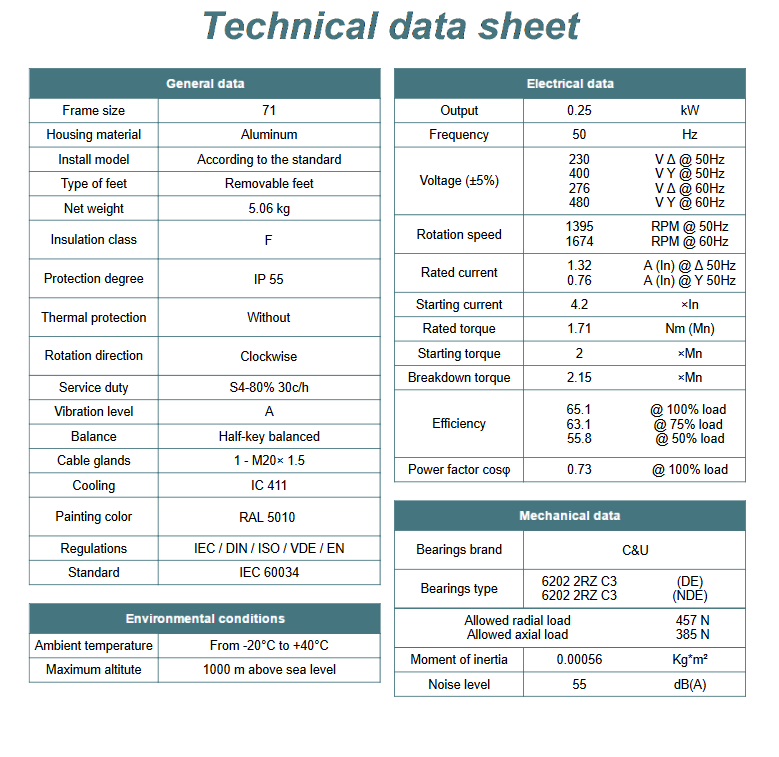 Kod producenta: MS 71 1-4 B3 (0,25kW 1400 obr/min)