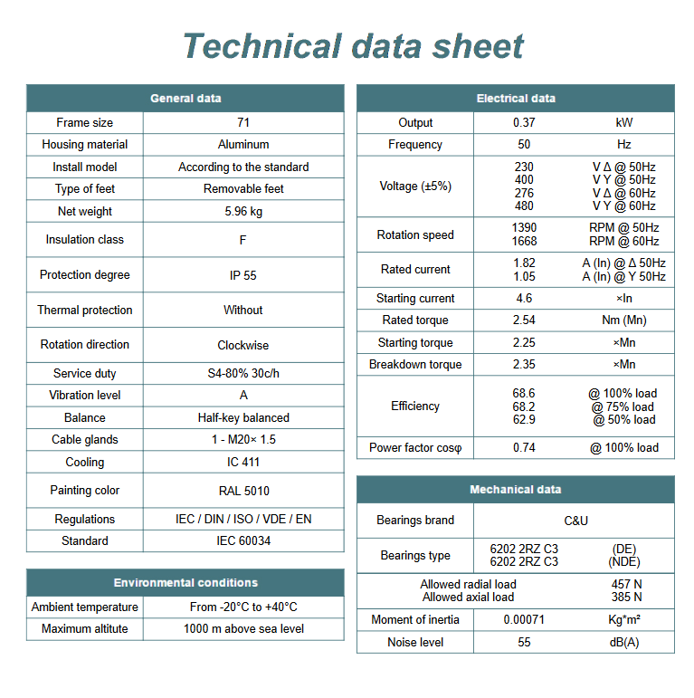 Kod producenta: MS 71 2-4 B3 ( 0,37kW 1400obr/min