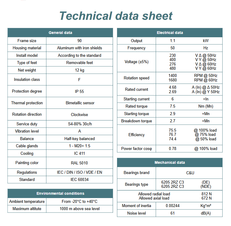 Kod producenta: MS 90S-4 B14 ( 1,1kW 1400obr/min)