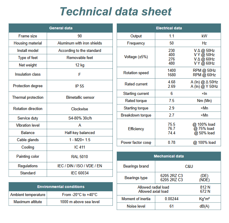 Kod producenta: MS 90S-4 B3 (1,1 kW 1400 obr/min)