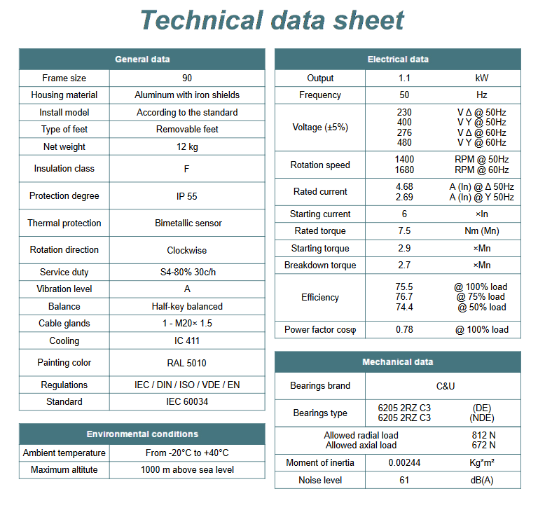 Kod producenta: MS 90S-4 B5 (1,1kW 1400 obr/min)