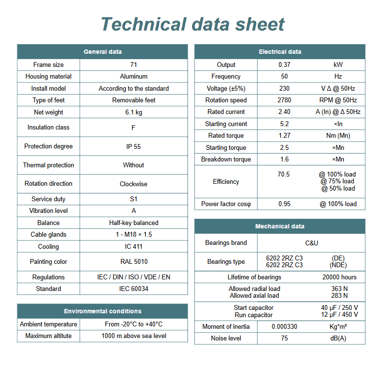 Silnik elektryczny jednofazowy 0,37kW 2800 obr/min. 71 B5 jest także bardzo energooszczędny, co przekłada się na mniejsze koszty eksploatacji. Posiada także ochronę przed przeciążeniem, co zwiększa jego bezpieczeństwo podczas pracy.
