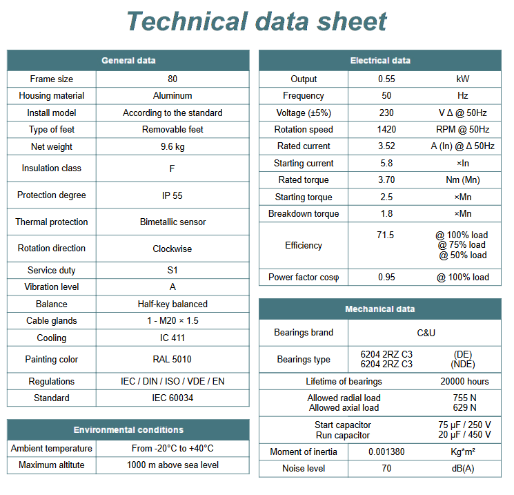 - Moc znamionowa kW - 0,55