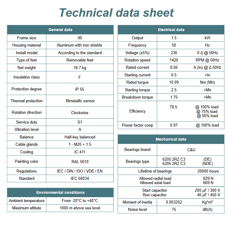 Kod producenta: ML 90L-4 B5 (1,5kW 1400 obr/min)