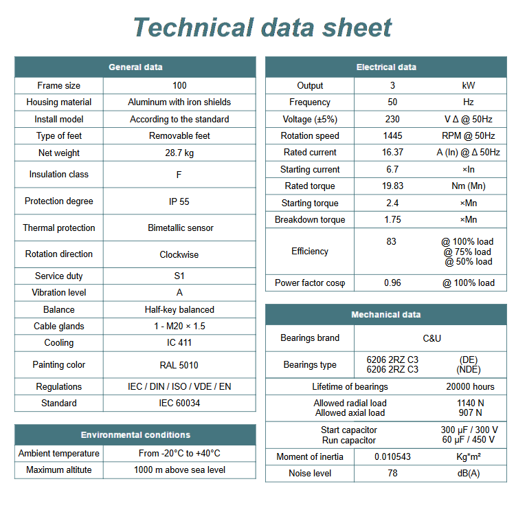 Centralnym elementem silnika jest wirnik zamontowany na wałku napędowym, który następnie połączony jest z różnymi elementami mechanicznymi. Dzięki 100 klasie izolacji termicznej, silnik jest odporny na przeciążenia i zapewnia długą żywotność.