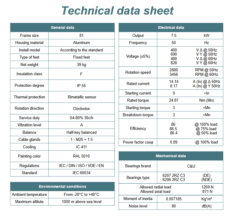 Silnik działa przy napięciu 400V, co pozwala na łatwe dostosowanie go do istniejącej sieci elektrycznej. Jego wydajność i wytrzymałość w połączeniu z niskim zużyciem energii elektrycznej sprawiają, że jest to jeden z najefektywniejszych silników dostępnych na rynku.